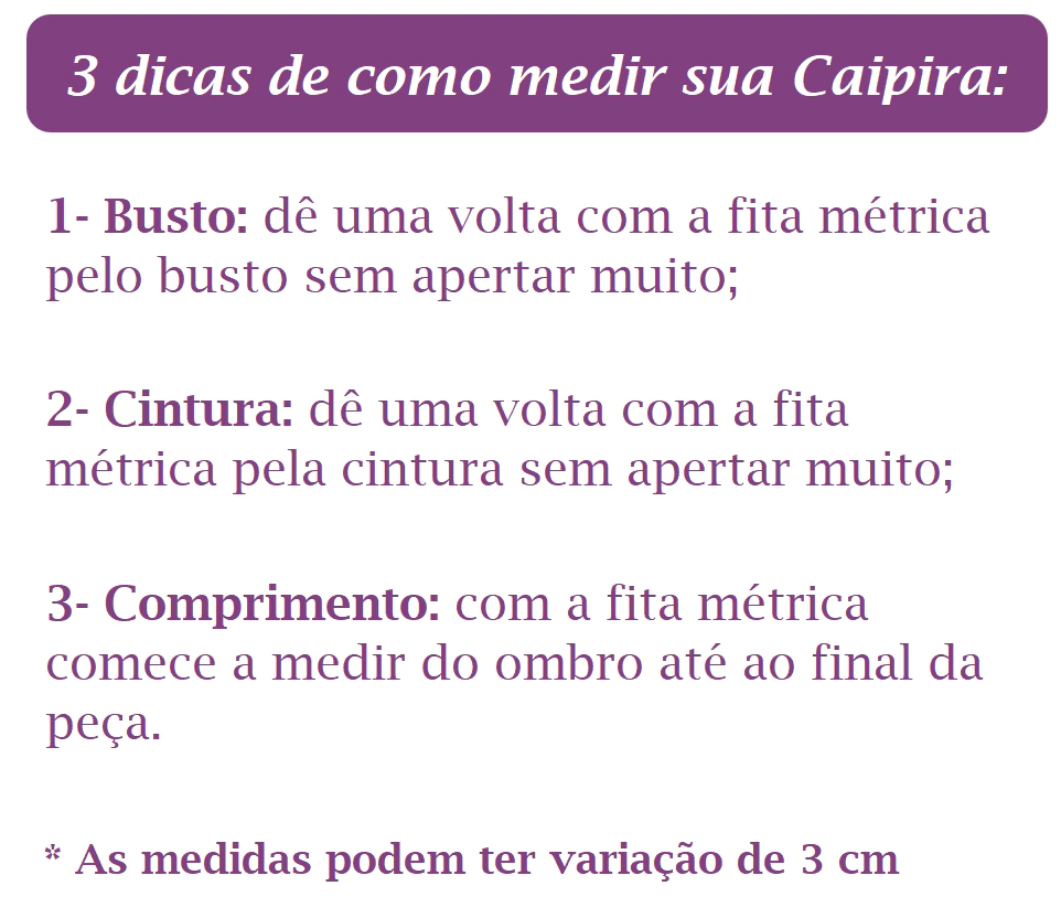 Produzido em tecidos delicados como chita e algodão leve, que exigem cuidados especiais. A lavagem deve ser à mão, e não é recomendada lavagem na máquina.