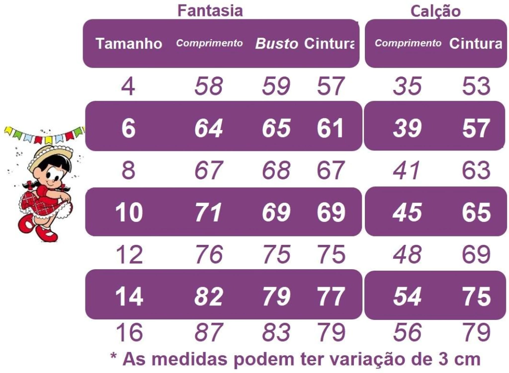 Verifique a tabela de medidas nas fotos do produto. Recomendamos escolher o tamanho com base nas medidas da criança — não pela idade.