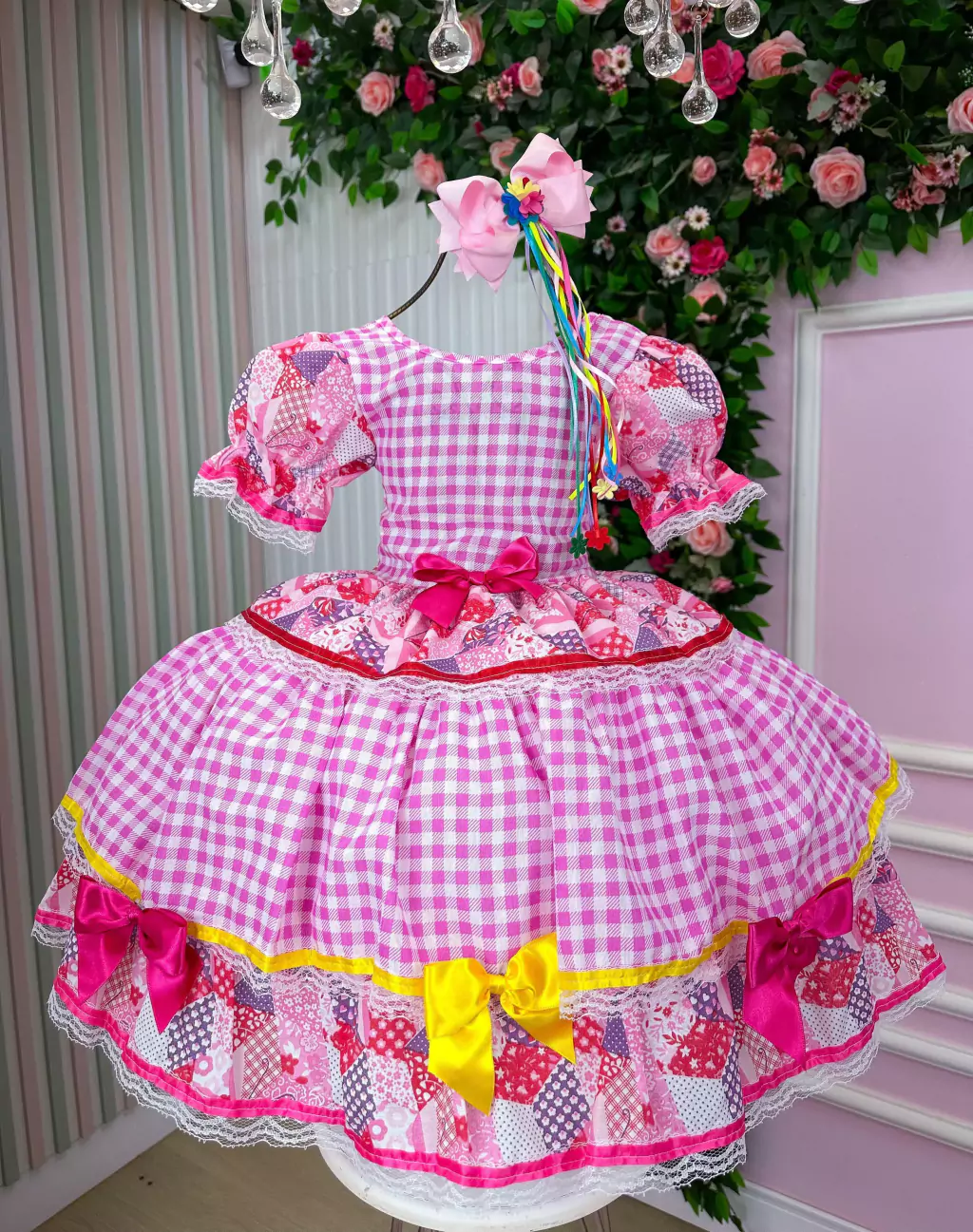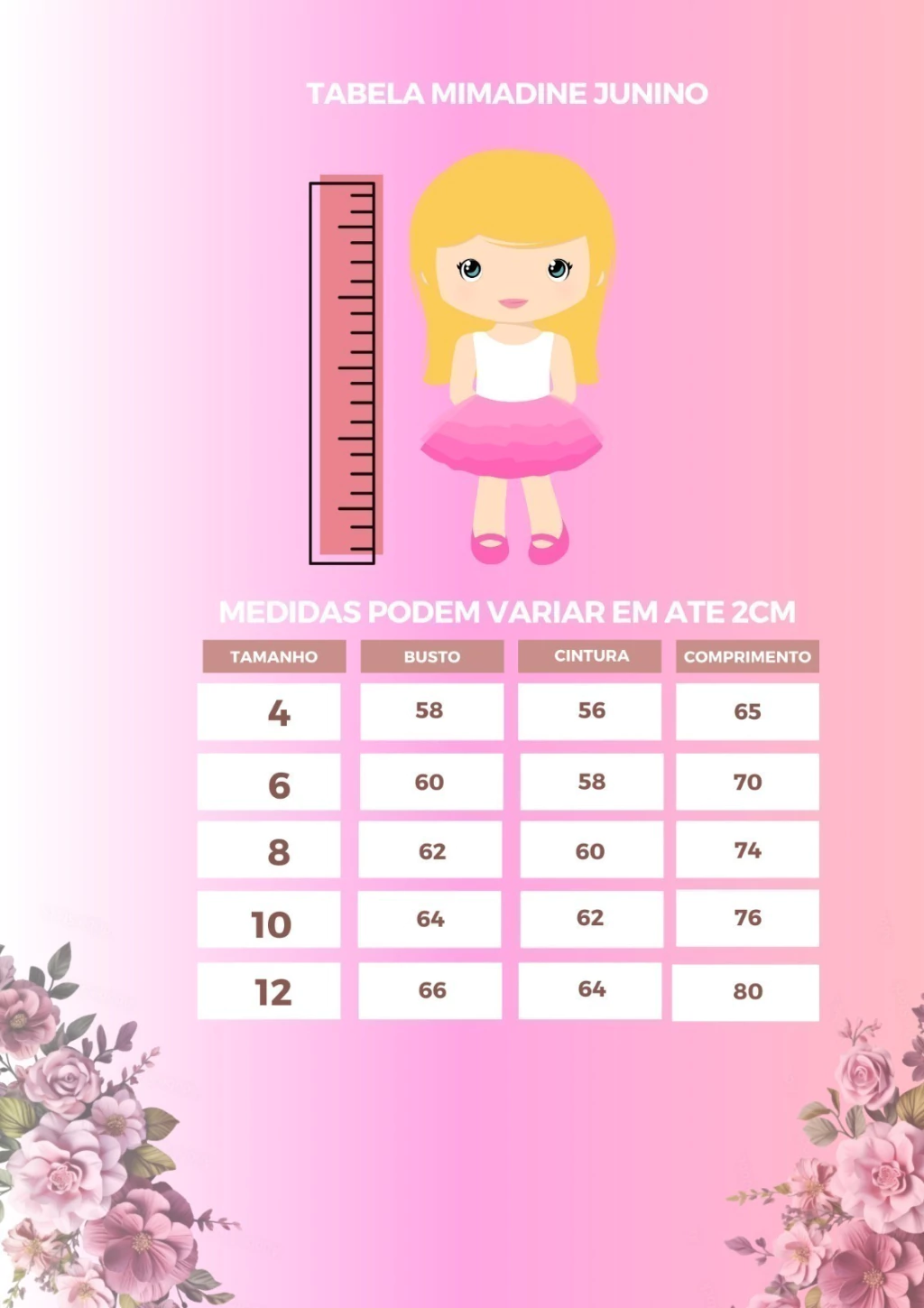 Com design encantador e caimento leve, este vestido é confeccionado em tecido 100% poliéster, ideal para quem busca estilo e praticidade nas festas juninas e julinas. Possui gola redonda, comprimento médio e mangas curtas, compondo um look confortável e sofisticado — perfeito para brilhar na quadrilha! 🌽💃